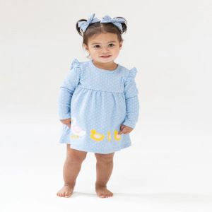 Classic fall style with a playful twist! Peter Pan Collar Dress and Ribbed Leggings are designed for sweet moments and stylish adventures. The dress is made from soft, breathable sunflower print organic muslin and features a dainty eyelet-trimmed Peter Pan collar for extra charm. Paired with cozy ribbed leggings. From pumpkin patches to cozy cuddle sessions, this darling set is a must-have for fall and winter! To keep your items in the best condition, we recommend washing on a cold, gentle cycle. To keep your items in the best condition turn them inside out and wash on a cold, gentle cycle. For optimal longevity, lay the garments flat to dry. If needed, tumble dry on low and use a cool iron. High heat will shrink 100% cotton garments. Dress: 100% Organic Cotton Muslin. Ribbed Modal Leggings: 94% Modal Rib 6% Spandex
